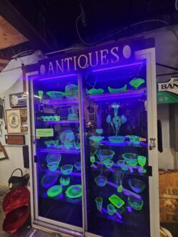 Black Kat Salvage II is also unique in that it’s more than just an antique store. In addition to antiques and collectibles, some booths sell homemade goods such as soap, jam and jelly, art, and other crafts. One seller even sells uranium glass products! Perhaps the ‘main attraction’ is Kool Kat’s Music Exchange, which has a massive collection of vinyl records with a special emphasis on classic rock and country. The Kool Kat section displays a variety of classic rock items from the 1960s through the 1990s. Some notable items on display include autographs from Head East and the cast of American Graffiti, and a large collection of Beatles and Kiss memorabilia.