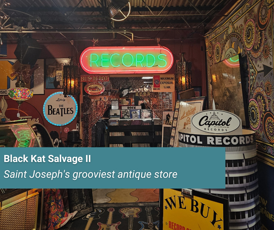 Black Kat Salvage II is one of many new antique stores to pop up over the last few years, and it’s definitely one of the most exciting and colorful ones in town. Starting off as a small antique market in 2019, Black Kat has flourished since that time and moved into its current location in 2024. The Black Kat name likely pays homage to the prominent Katz Drug Store chain that had once prospered in St. Joseph back in the day.