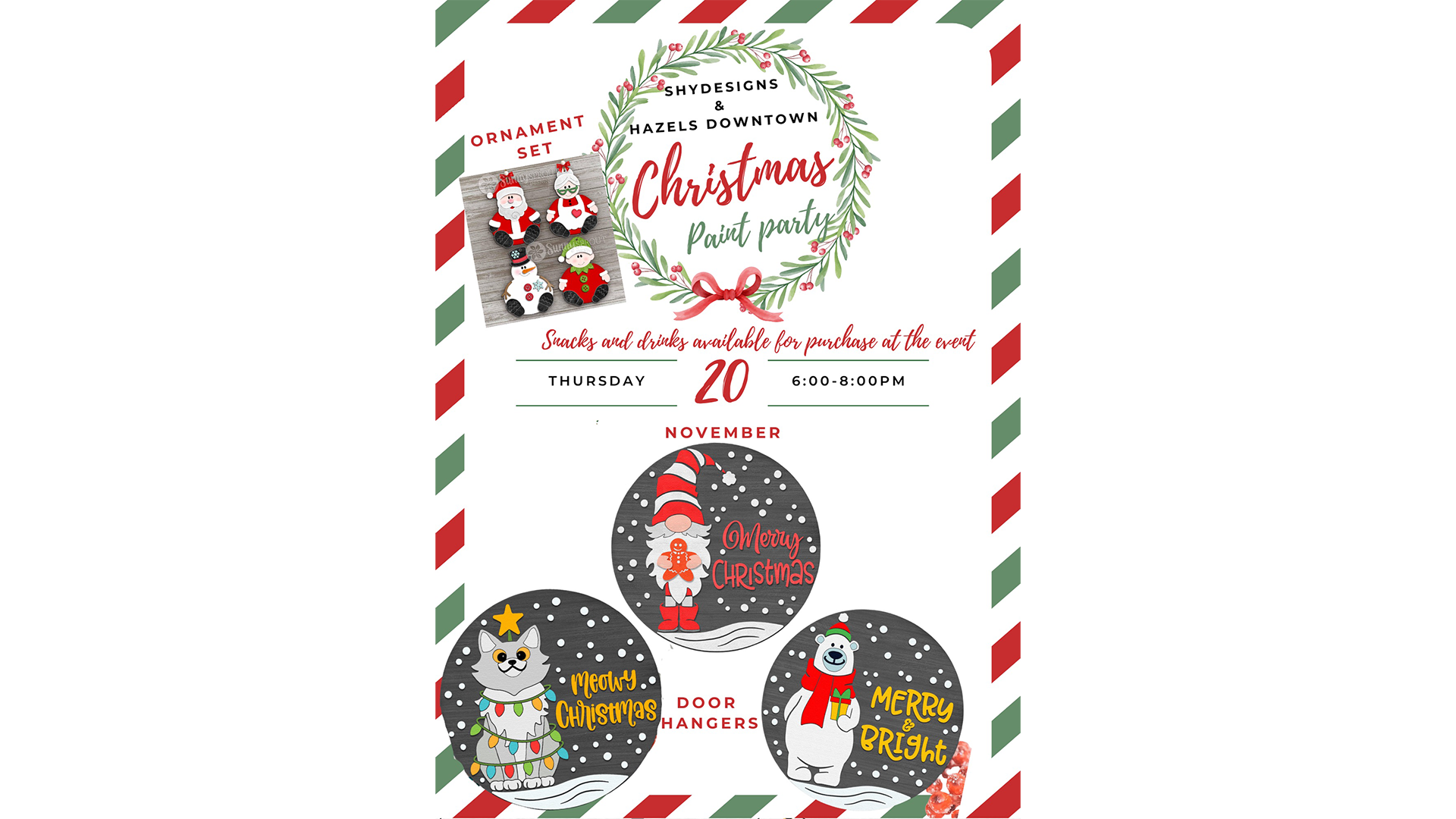 Get into the holiday spirit with a guided Christmas paint party hosted by ShyDesigns at Hazel’s Downtown. On Thursday, November 20, 2025 from 6 to 8 PM, you will create a festive piece to keep or gift. Choose a Christmas door hanger or a set of ornaments. No experience required. ShyDesigns provides step by step instruction and all art supplies.