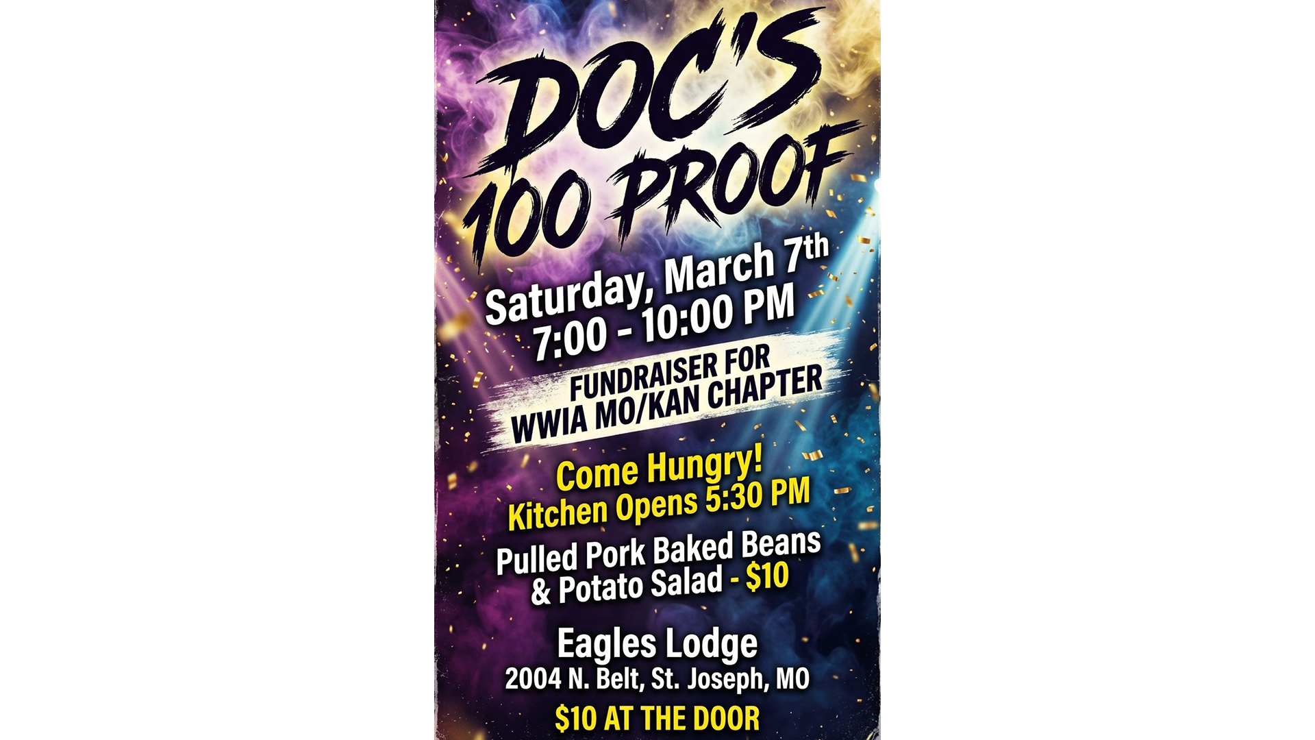 Doc’s 100 Proof will perform live on Saturday, March 7 from 7:00 to 10:00 PM at Eagles Lodge, 2004 N. Belt, St. Joseph, Missouri. This event is a fundraiser for the WWIA MO/KAN Chapter. The kitchen opens at 5:30 PM and dinner will be available for $10 (pulled pork, baked beans, and potato salad). Admission is $10 at the door.