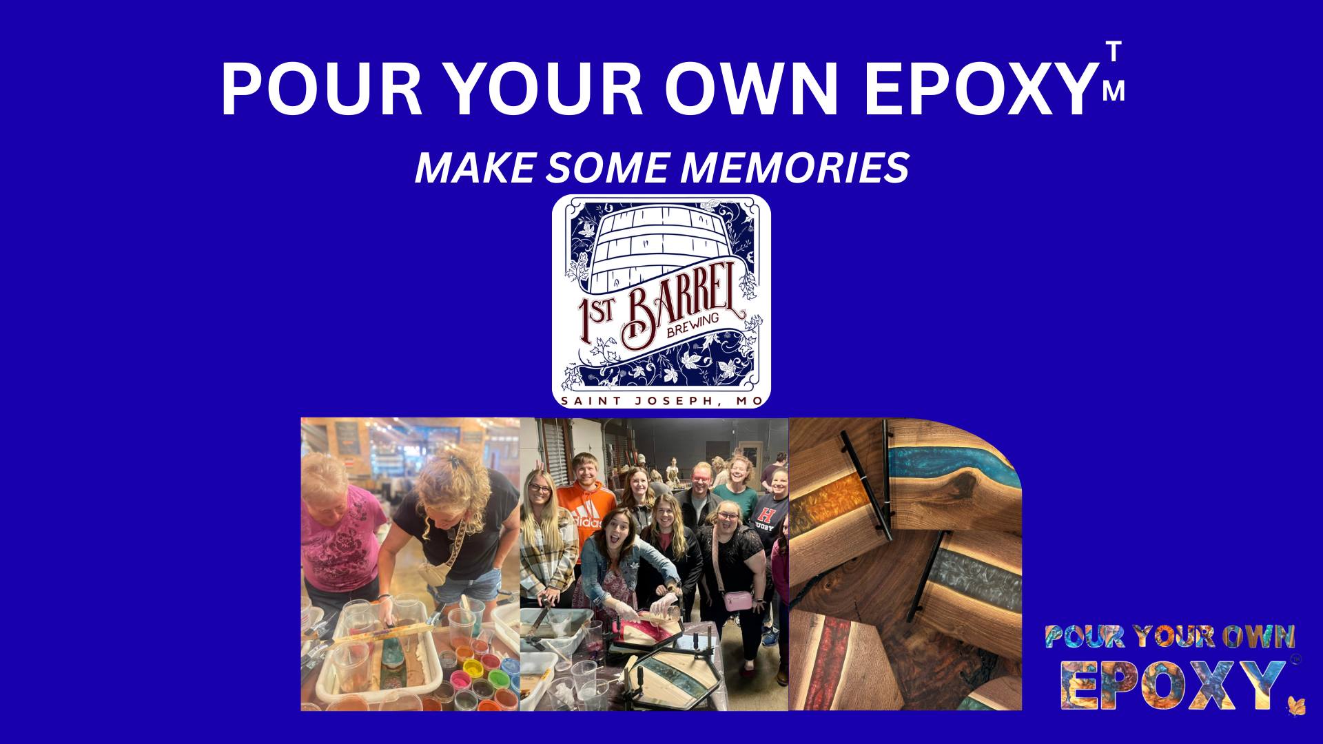 Join Pour Your Own Epoxy for a fun, hands-on workshop at 1st Barrel Brewing in St. Joseph, Missouri, on Monday, May 11, 2026, from 6:00 PM to 8:00 PM. Create your own custom epoxy project using premium black walnut and other fine hardwoods accented with epoxy in up to two colors of your choice.