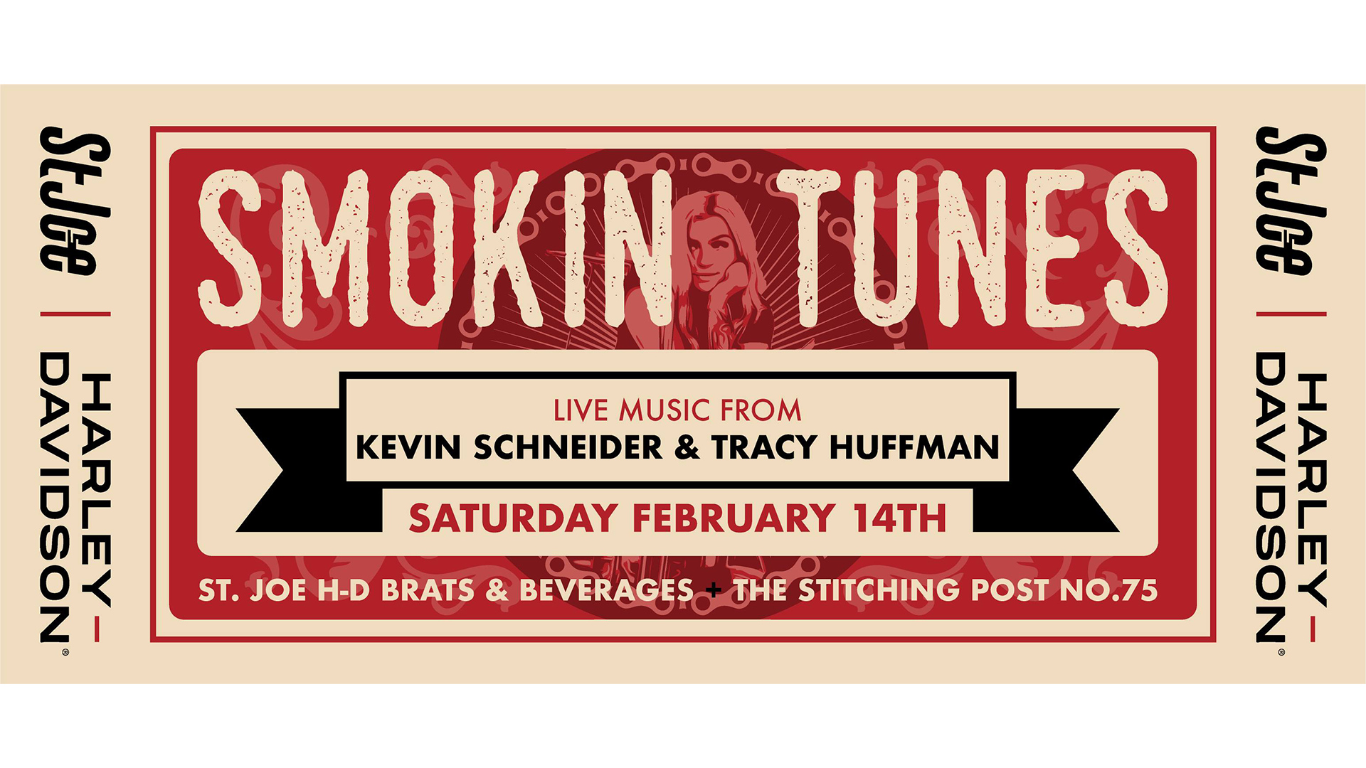 Smokin Tunes returns Saturday, February 14, 2026 from 12 PM to 4 PM at St. Joe Harley Davidson. Enjoy live music from Kevin Schneider and Tracy Huffman, plus St. Joe H D brats, beverages, and custom stitching and embroidery by The Stitching Post No.75.