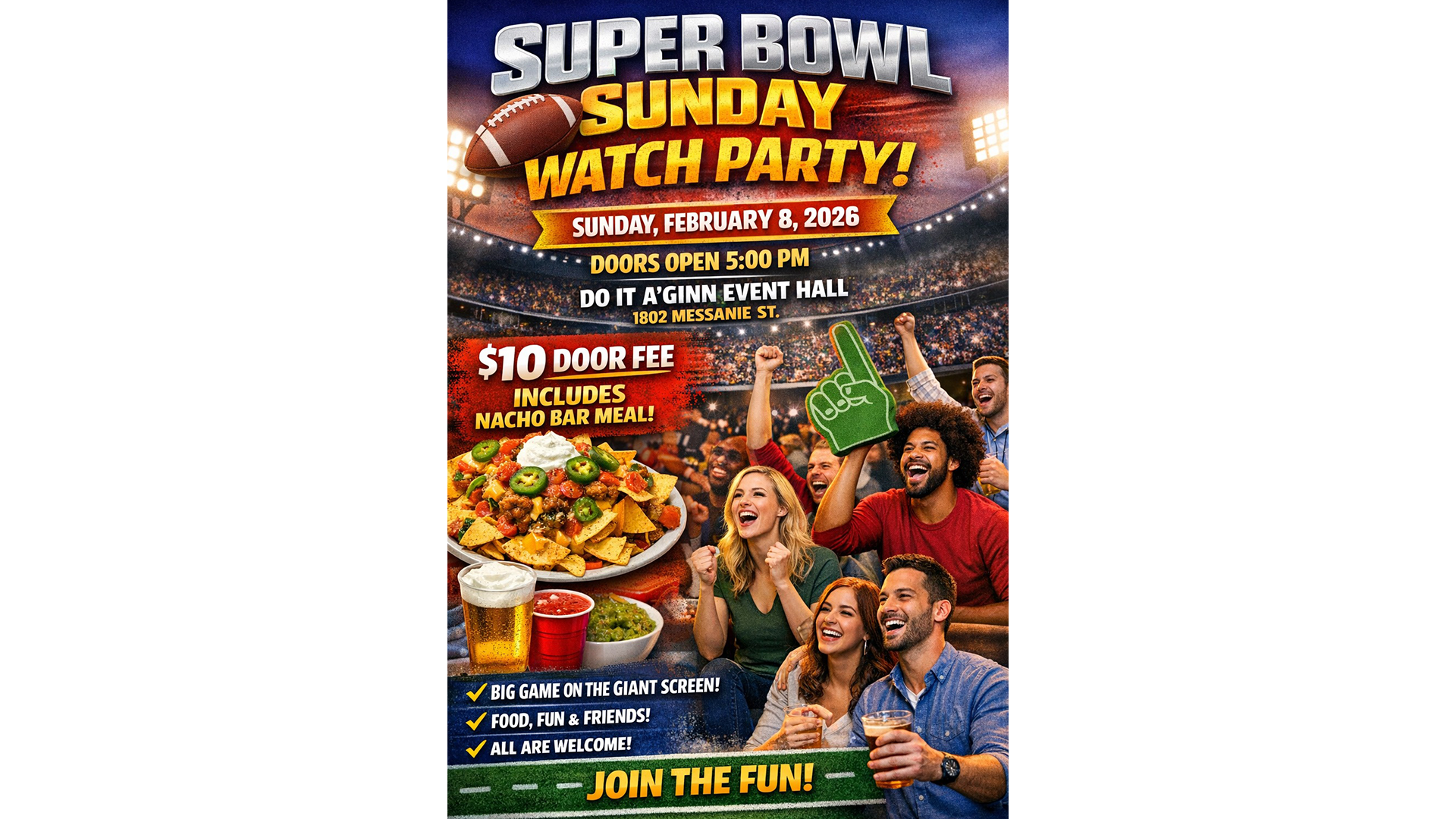 Join us for a Super Bowl 60 Watch Party at Do It A’Ginn Event Hall in St. Joseph. Doors open at 5:00 PM and the game will be shown on a giant screen. Admission is $10 and includes a nacho bar meal. Bring your friends, grab some food, and enjoy the game together. All are welcome.