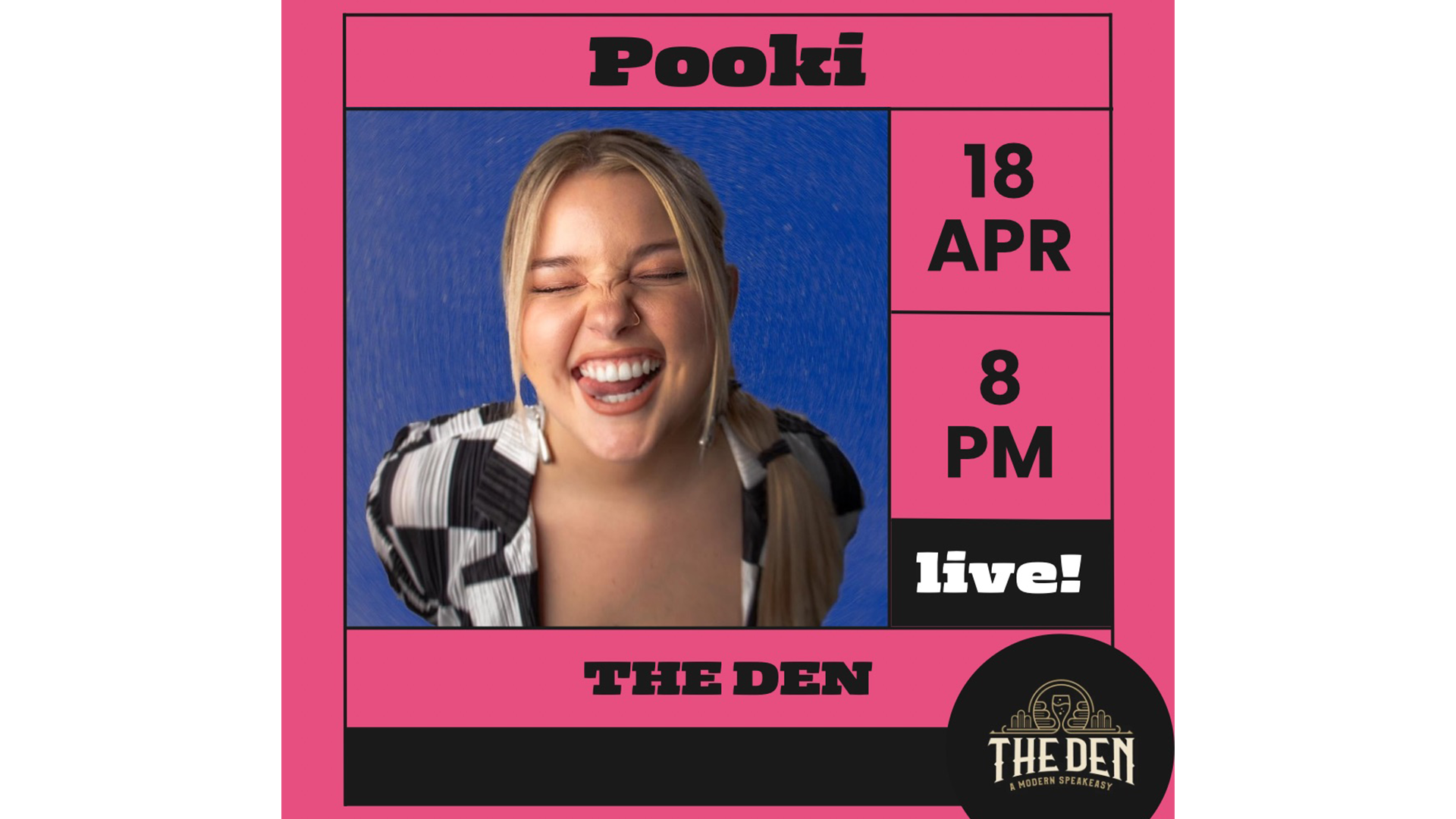 The Den 519 Felix Street, Saint Joseph, MO, United StatesJoin us at The Den on Saturday, April 18, 2026 at 8 PM for live music with Pooki. A crowd favorite, Pooki always brings a fun and energetic show. This is a free event, and seating can fill up quickly, so arriving early is recommended. Guests must be 21 and older after 8 PM.