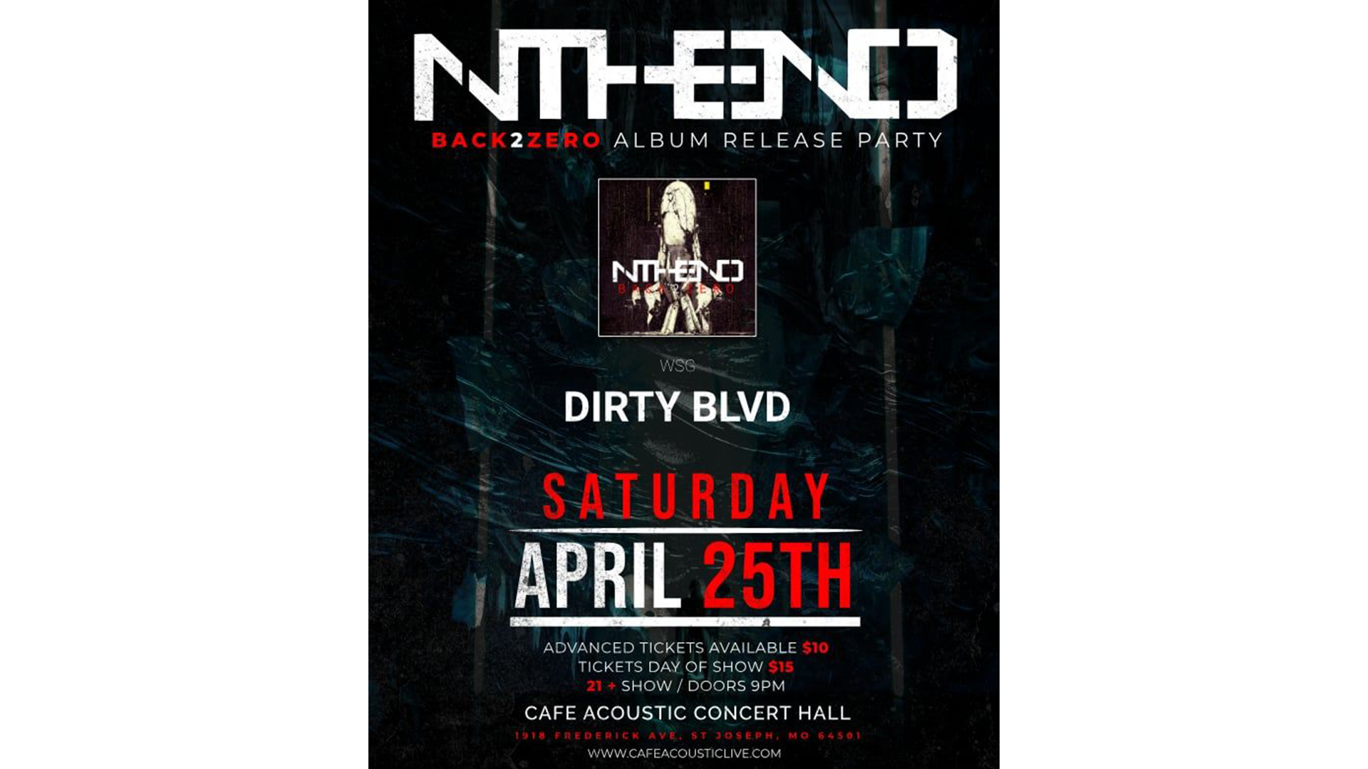 Join Ntheend for the Back2Zero Album Release Party on Saturday, April 25, 2026, at Cafe Acoustic Concert Hall in St. Joseph. Special guest Dirty BLVD will help kick off a night of live music, high energy, and celebration as Ntheend marks the release of Back2Zero. Doors open at 9 PM for this 21 and over... View Article