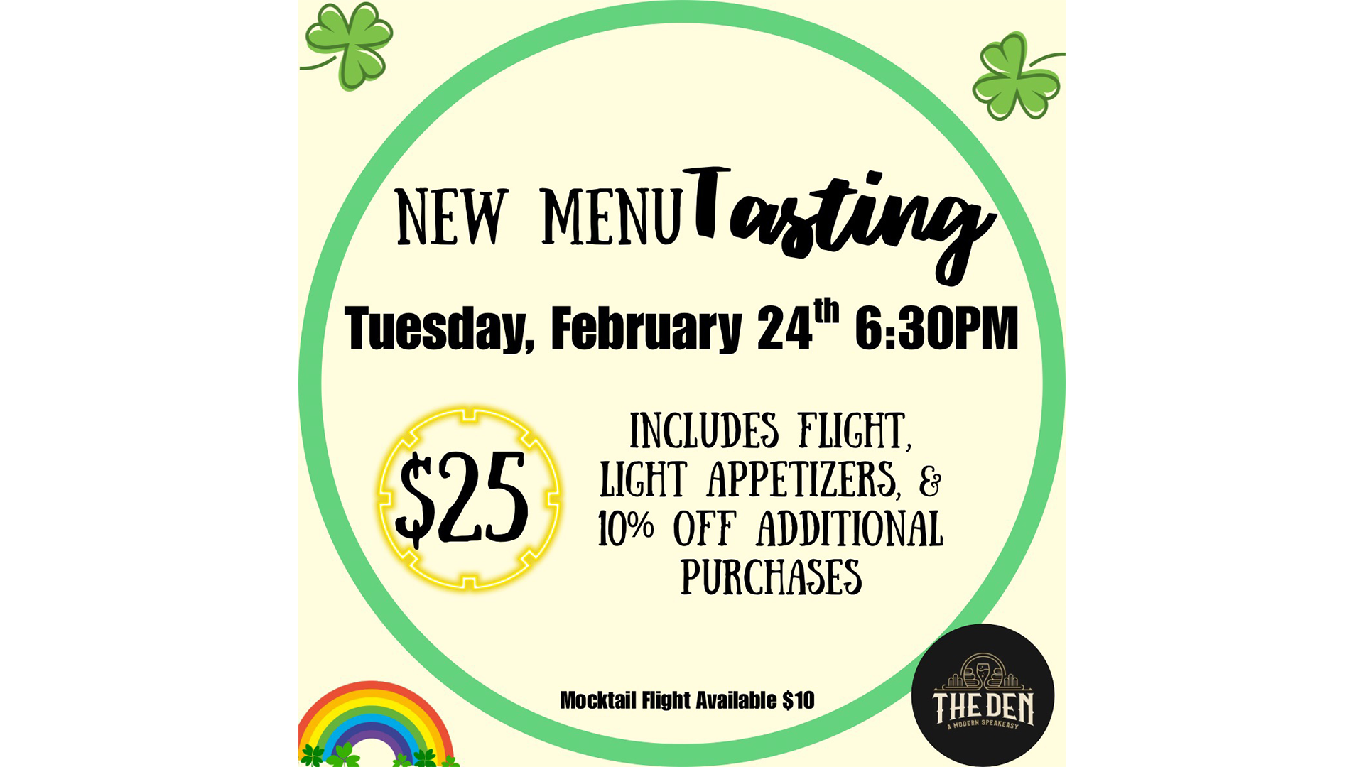 New month, new menu. Join The Den for a tasting of their new March cocktail lineup, all in one flight. Snacks and appetizers are included, and you will receive 10... View Article