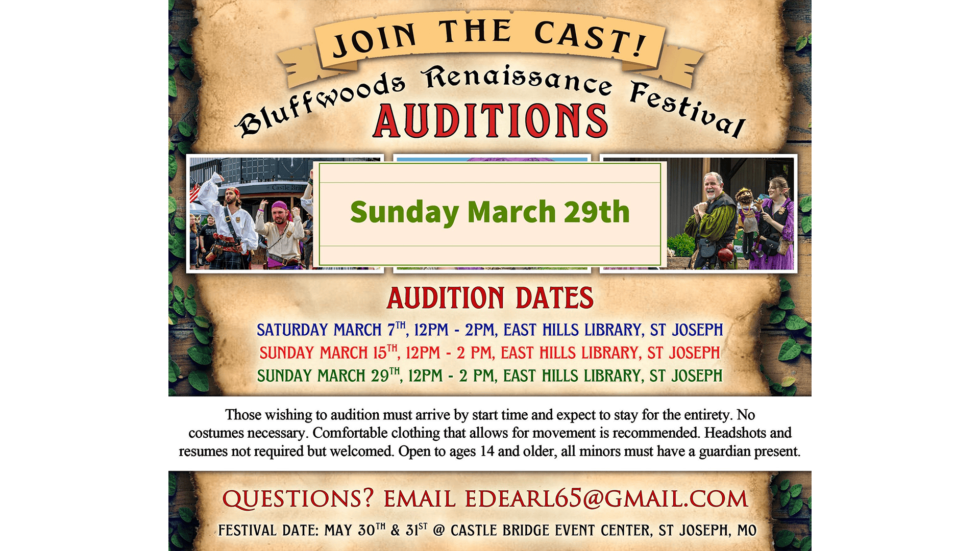 East Hills Library 502 N Woodbine Road, Saint Joseph, MO, United StatesStep into the world of the Bluffwoods Renaissance Festival by auditioning for the 2026 cast. Auditions will be held Sunday from 12 PM to 2 PM at the East Hills... View Article