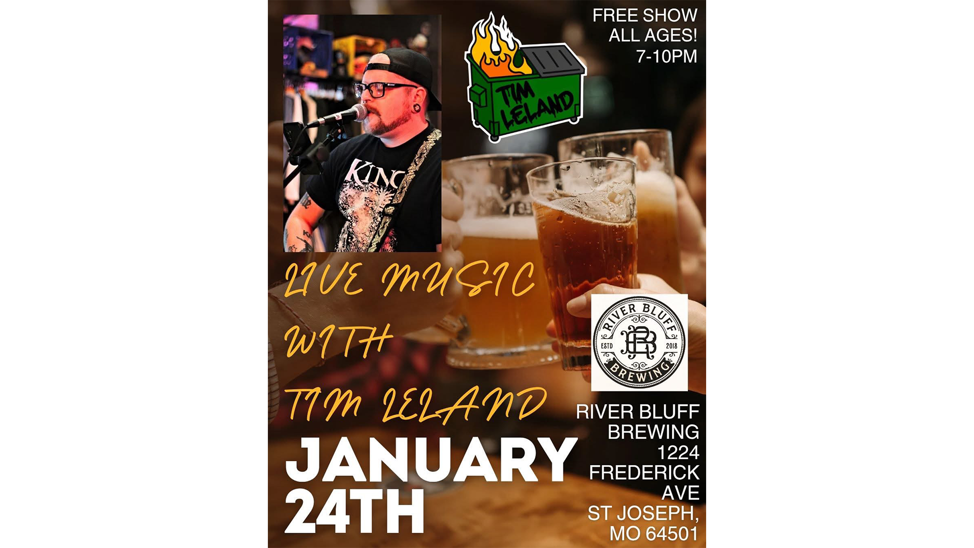 River Bluff Brewing 1224 Frederick Ave., Saint Joseph, MO, United StatesCome out to River Bluff Brewing in St. Joseph, Missouri for a free all ages live music show with Tim Leland on Saturday, January 24, 2026. Music runs from 7:00... View Article