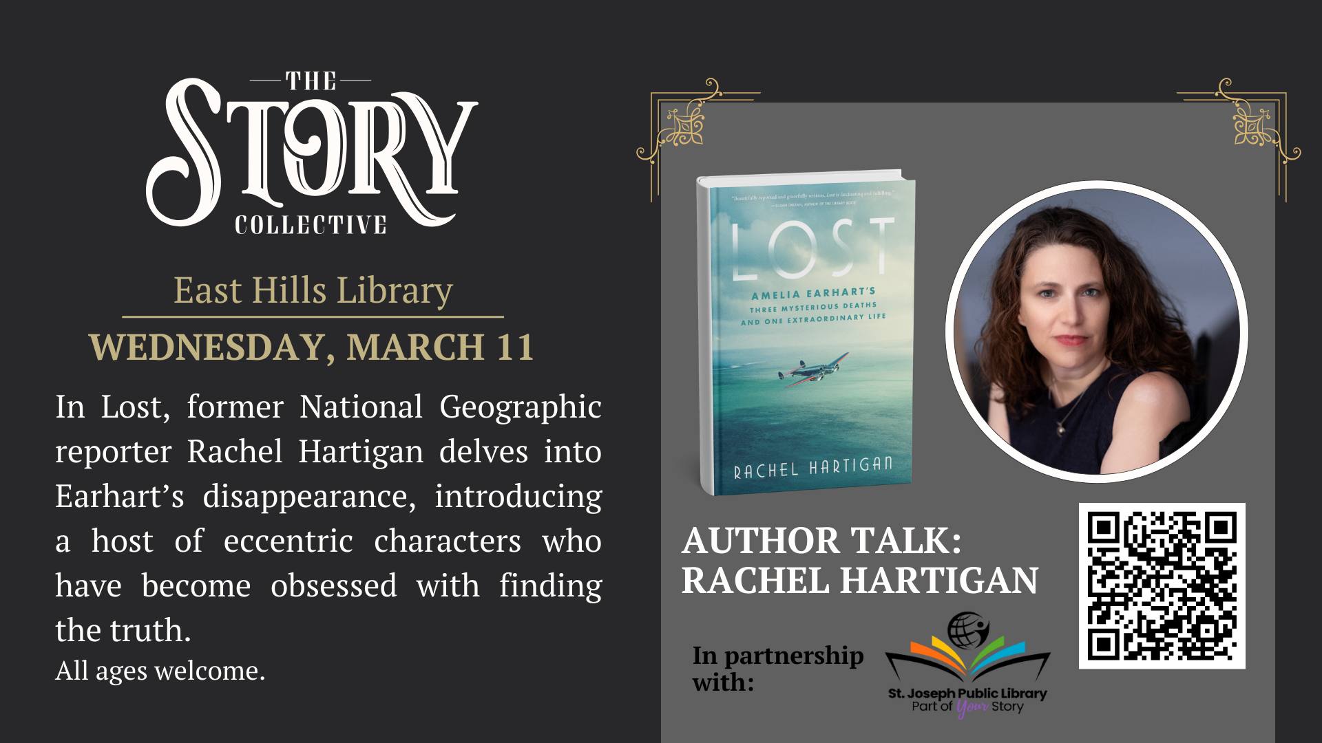 East Hills Library 502 N Woodbine Road, Saint Joseph, MO, United StatesJoin The Story Collective at East Hills Library for an author talk with Rachel Hartigan. Hartigan, a former National Geographic writer and editor and former Book World editor at The Washington Post, will discuss her book Lost, a riveting investigation into Amelia Earhart’s disappearance. The book follows three leading theories and takes readers from Atchison,... View Article