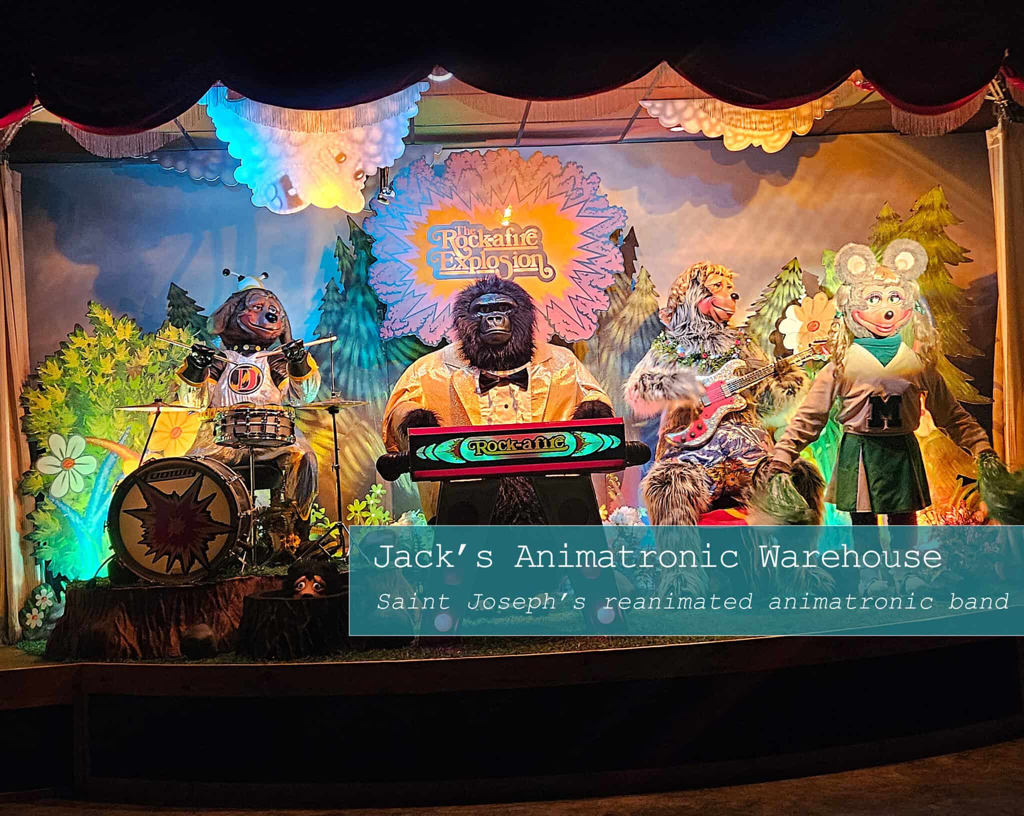 Showbiz Pizza was gone, but the Rockafire Explosion managed to survive. Unlike other surviving bands, Jack had to start nearly from scratch. After fixing and reselling animatronics, he was finally able to acquire the frames for the entire band in 2019. Aaron Fetcher, who Jack described as his mentor, gave him the original cosmetic design plans for the animatronics, which allowed him to refurbish the animatronics with pinpoint attention to detail. With help from his family, the stage was set (quite literally) for the band to make their comeback in July of 2023. With the original tapes from the 11980s and with the original controls in place, the Rockafire Explosion played in St. Joseph for the first time in 36 years.