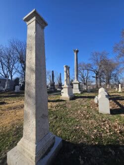 Most people, however, go for the sight seeking. The cemetery is an architectural treasure trove with unique mausoleums, beautiful marble statues, towering granite obelisks, and even rare 1840s limestone tombstones, which aren’t often seen West of the Mississippi. The architectural diversity and emphasis on beauty are intentional. When the cemetery was redesigned in 1872, it was done in lockstep with the Rural Garden Cemetery movement, which was popular at the time. This movement sought to clean up cemeteries and make them suitable for public gatherings and recreation, which was a precursor to modern parks. Although intensive restoration work is still ongoing in the older parts of the cemetery, the cemetery is still a beautiful place for long walks.