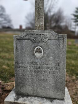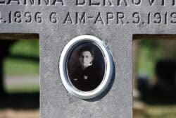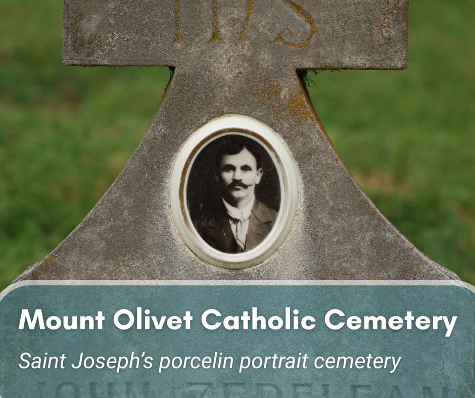 As you stroll along the graves, you’ll notice that some of the old tombstones have porcelain portraits of the deceased (or at least had one at some point). The people in the photos are all dressed up in their Sunday best and stare at the viewer with blank expressions. Like many other graves in the cemetery, you’ll find that their inscriptions may be in a foreign language. Many stones include inscriptions in languages like German and Polish, reflecting St. Joseph’s immigrant communities. These portraits (also known as ‘Dedos’) were popular in the early 1900s, especially among immigrant populations from Southern and Eastern Europe. The majority of these portraits were produced by the J.A. Dedouch Company in Illinois (hence the nickname, ‘Dedo’). These portraits offered a lasting likeness at a time when printed photos weren’t as common in every household. Compared to other larger cemeteries with portraits, the surviving portraits here are in remarkable condition, with some even still bearing the original Dedo watermark.