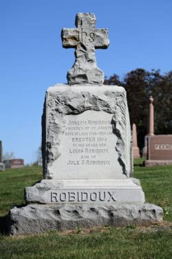 Many of St. Joseph’s first settlers and explorers are buried here, including Joseph Robidoux, the founder of St. Joseph. The circumstances of his internment are somewhat mysterious. Initially, he and his family were buried at the old Calvary Cemetery on Garfield Road. In 1908, the family plot was scheduled to be dug up and moved to Mount Olivet. According to tradition, Joseph Robidoux was buried in a lead coffin in 1868. Local tradition says even though the remains of other family members were located and moved, Robidioux’s lead coffin was never found. All but one of the family’s markers were replaced. Mitchell Robidoux’s (one of Joseph’s brothers) original grave was rediscovered in a rock pile on Noyes Avenue in the 1950s and was given its permanent home in Mount Olivet.