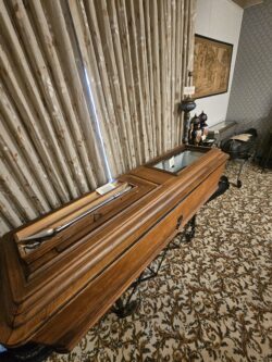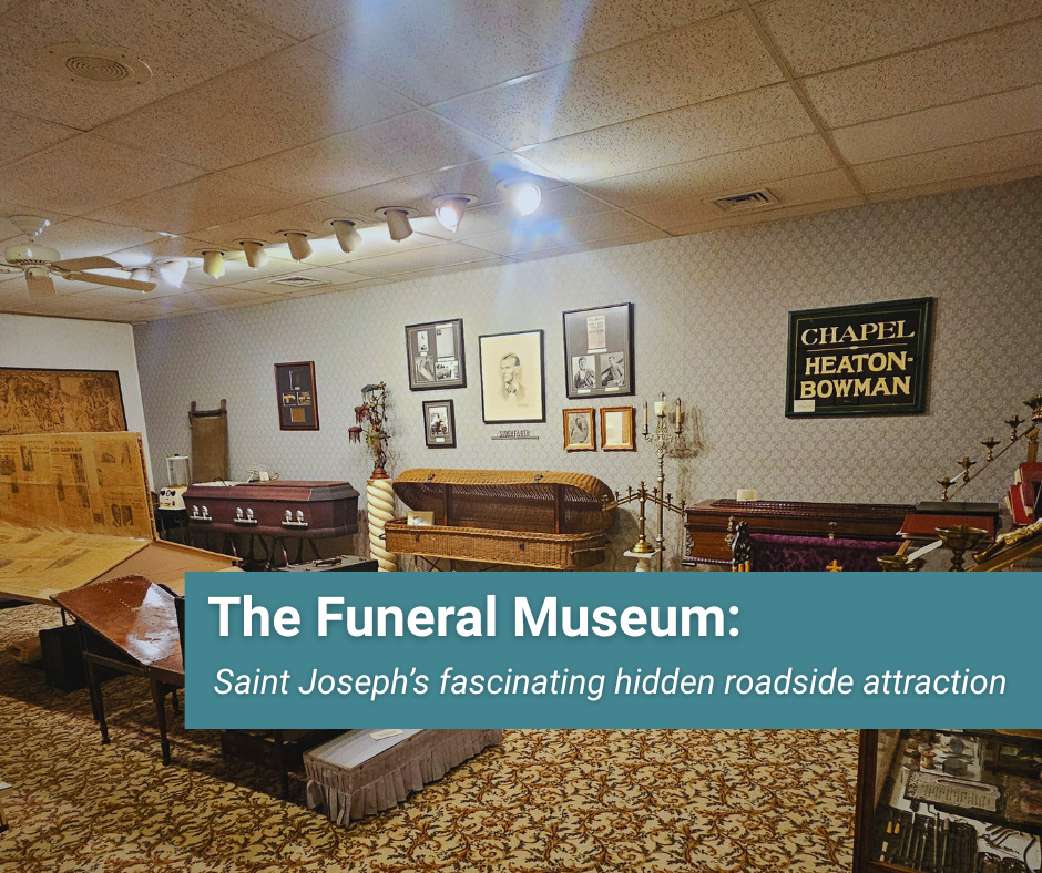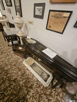 Now, you might be wondering why a funeral home would create a museum space in the first place. Heaton Bowman Smith & Sidenfaden Funeral Home was formed as a combination of the historic Heaton-Bowman, Smith, and Sidenfaden Funeral Homes. Heaton-Bowman was founded in 1842, making it the oldest local business and the oldest active funeral home in the state. In addition, David Johnson Heaton is credited to be the first funeral director and professional undertaker in the United States. Sidenfaden Funeral Home was founded in 1856 and was the funeral parlor in which Jesse James’ body was prepared for burial. This current location on Frederick Avenue was opened in 1968 under Heaton-Bowman-Smith, with Sidenfaden Funeral Home joining them in 1976.