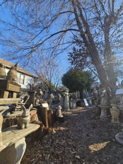 At the entrance, countless sculptures lined the entryway. Tony told me that these were the statues ready to be picked up. Inside the garden, there were sculptures and statues of all kinds. Humorous flat tablets, bird baths, religious sculptures, turtles, benches, gnomes, fairies, wolves, wizards, pillars, and a whole host of other whimsical displays lined the walkways of the garden. It’s a remarkable sight and one that viewing it from the street doesn’t do justice to. At the front of the house, there is even a section dedicated to statues of Dogs and Cats.